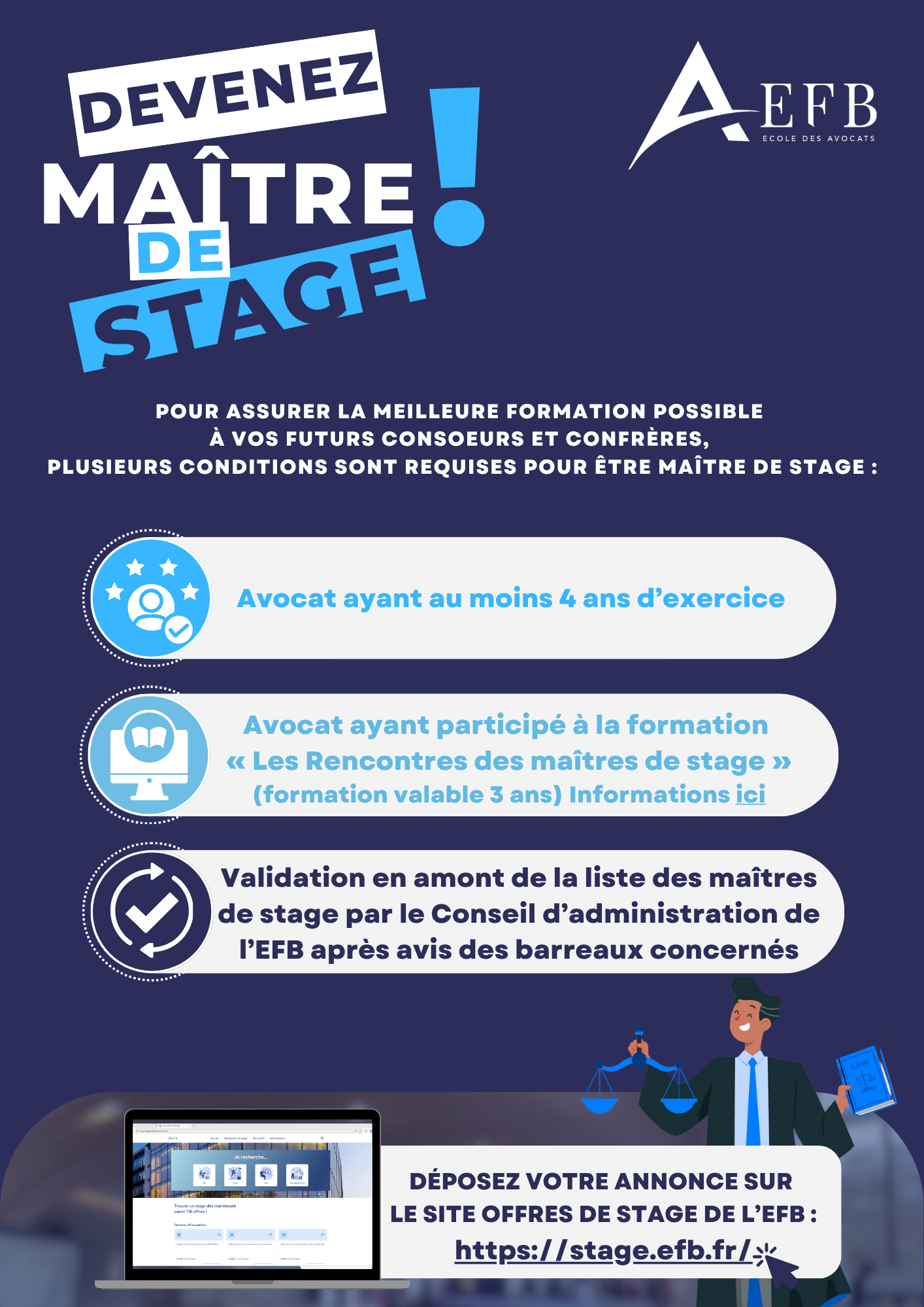 Afin d’assurer les meilleures conditions possibles du stage final en cabinet d’avocats, tant pour les élèves de l’EFB que pour les maîtres de stage, la direction de l’EFB organise régulièrement les Rencontres des Maîtres de stage.