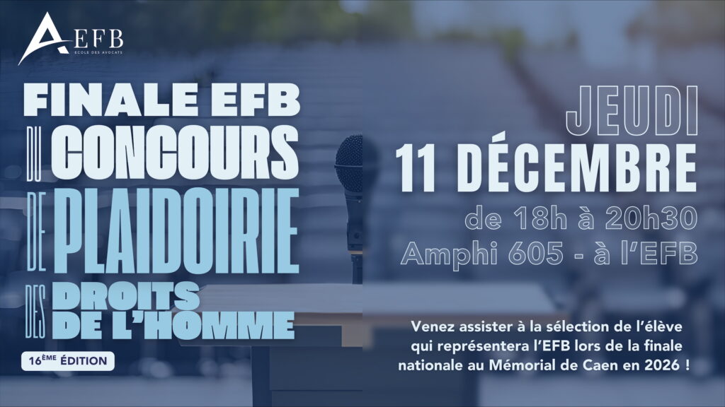 Venez nombreux à Issy (amphithéâtre du 6ème étage) ce jeudi 11 décembre, à partir de 18h00, pour écouter les plaidoiries des candidats retenus pour participer à la finale EFB du Concours national de plaidoiries pour les droits de l’Homme.