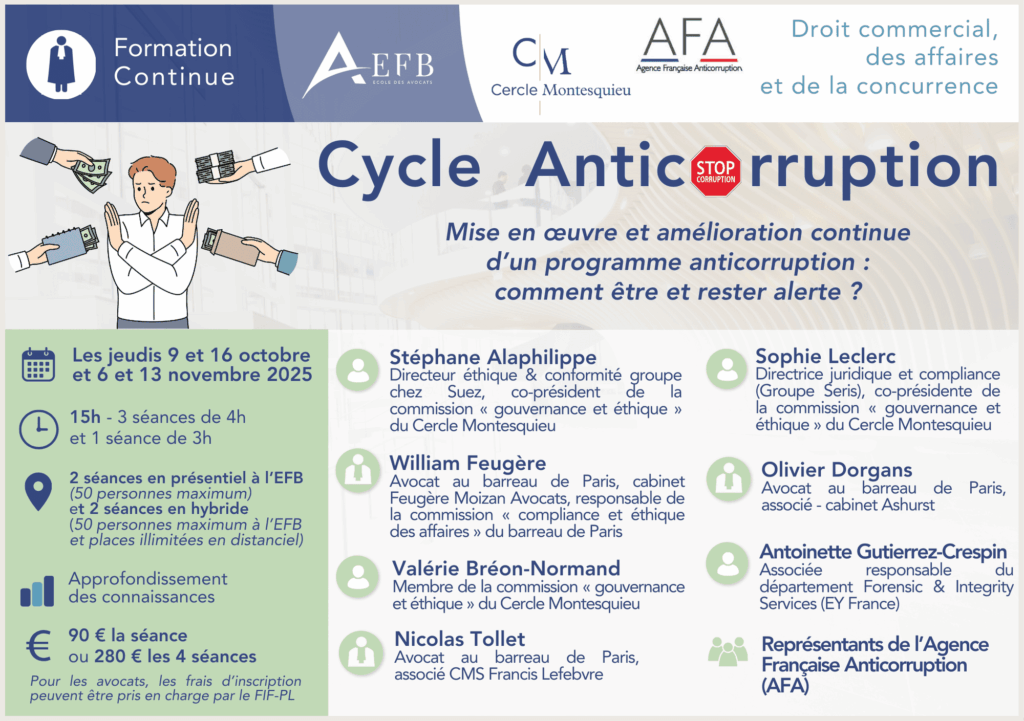 L’EFB propose en partenariat avec l’Agence française anticorruption et le Cercle Montesquieu une formation pragmatique et interactive conçue pour armer les avocats, juristes et directeurs juridiques face aux exigences de conformité, éthique et gouvernance.