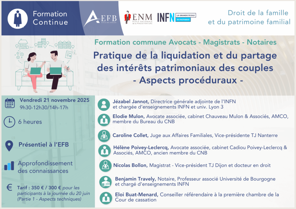 Pour plus d’informations ou pour vous inscrire : ACCUEIL – [EFB] Pratique de la liquidation et du partage des intérêts patrimoniaux des couples – Partie 2/2 – Aspects procéduraux